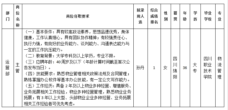 根據(jù)綿陽(yáng)市康來物業(yè)服務(wù)有限公司發(fā)布的招聘公告及招聘相關(guān)規(guī)定,經(jīng)筆試、面試、背景調(diào)查等程序,擬錄用孫丹同志到綿陽(yáng)市康來物業(yè)服務(wù)有限公司運(yùn)營(yíng)部工作,現(xiàn)予以公示,具體情況如下: