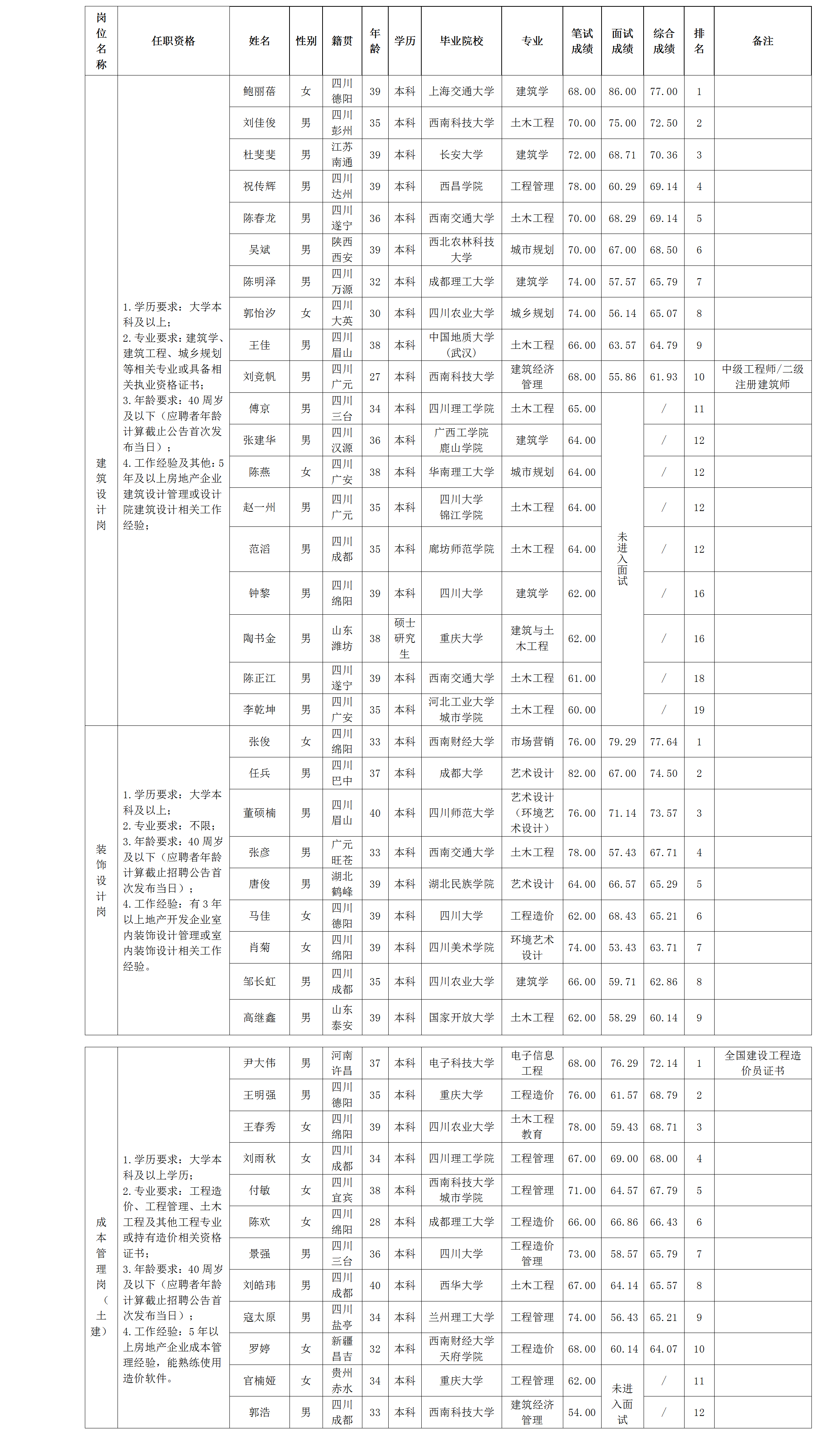 根據(jù)綿陽(yáng)市綿投置地有限公司發(fā)布的招聘公告及招聘相關(guān)規(guī)定,經(jīng)筆試、面試等程序,現(xiàn)將筆試、面試成績(jī)予以公示。
