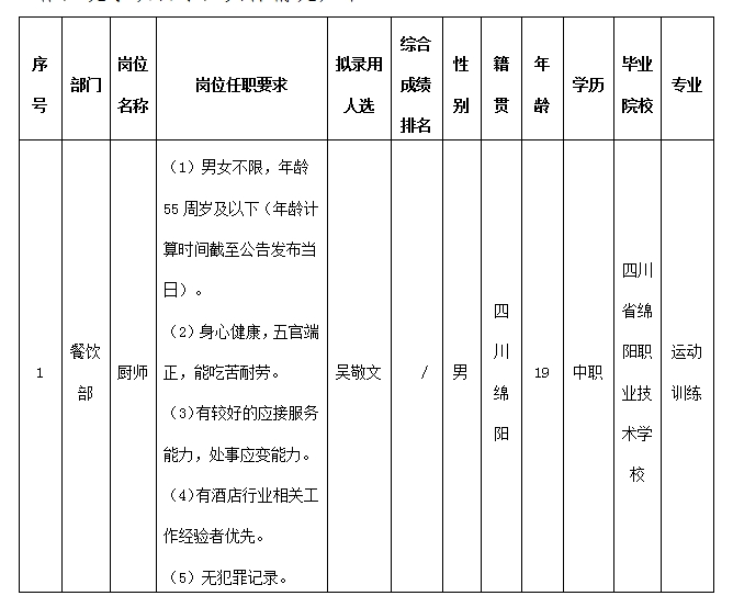 根據(jù)綿陽市東津酒店管理有限責任公司發(fā)布的招聘公告及招聘相關(guān)規(guī)定,通過面試等程序,錄用吳敬文同志到餐飲部工作,現(xiàn)予以公示,具體情況如下: