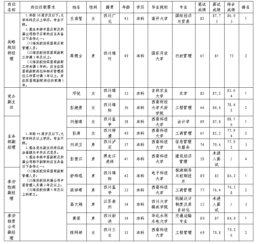 【內(nèi)部競聘】綿陽市汽車實驗駕駛技術(shù)學(xué)校股份有限公司 關(guān)于戰(zhàn)略規(guī)劃部經(jīng)理等崗位內(nèi)部競聘測試成績的公示
