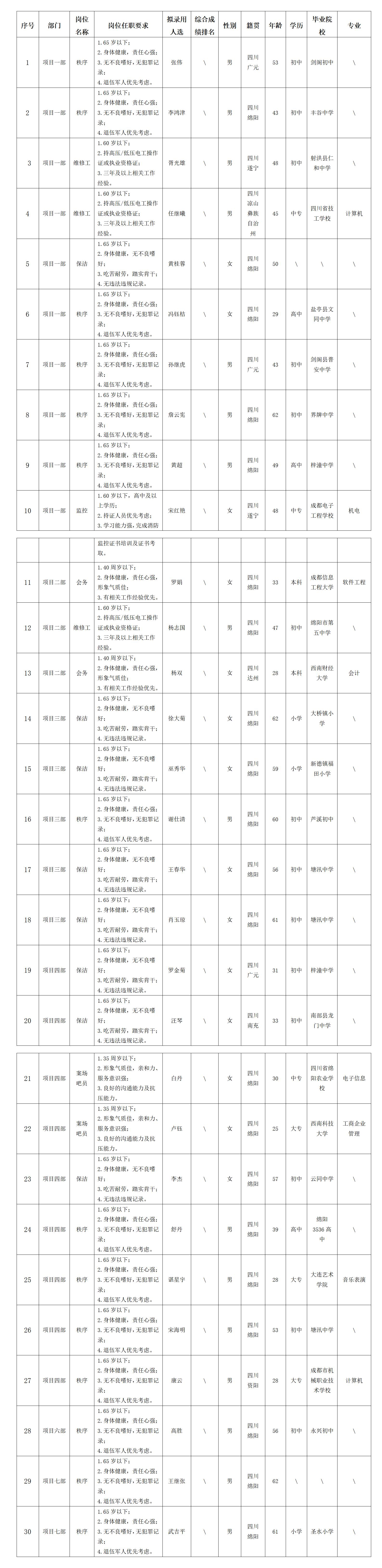 根據(jù)綿陽市康來物業(yè)服務(wù)有限公司發(fā)布的招聘公告及招聘相關(guān)規(guī)定,經(jīng)面試等程序,擬錄用張偉等同志到各項(xiàng)目部工作,現(xiàn)予以公示,具體情況如下: