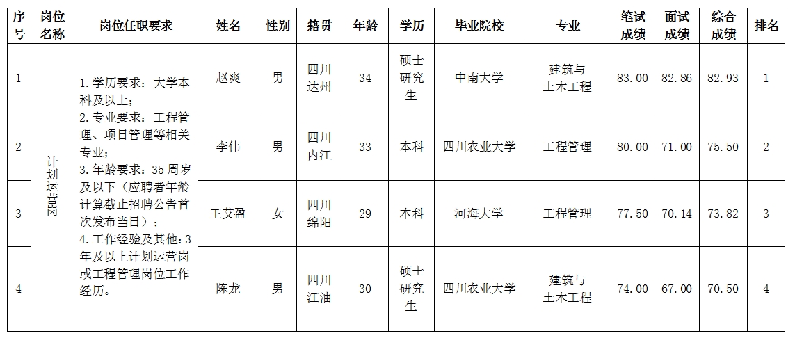 根據(jù)綿陽市綿投置地有限公司發(fā)布的招聘公告及招聘相關(guān)規(guī)定,經(jīng)筆試、面試等程序,現(xiàn)將筆試面試成績予以公示。