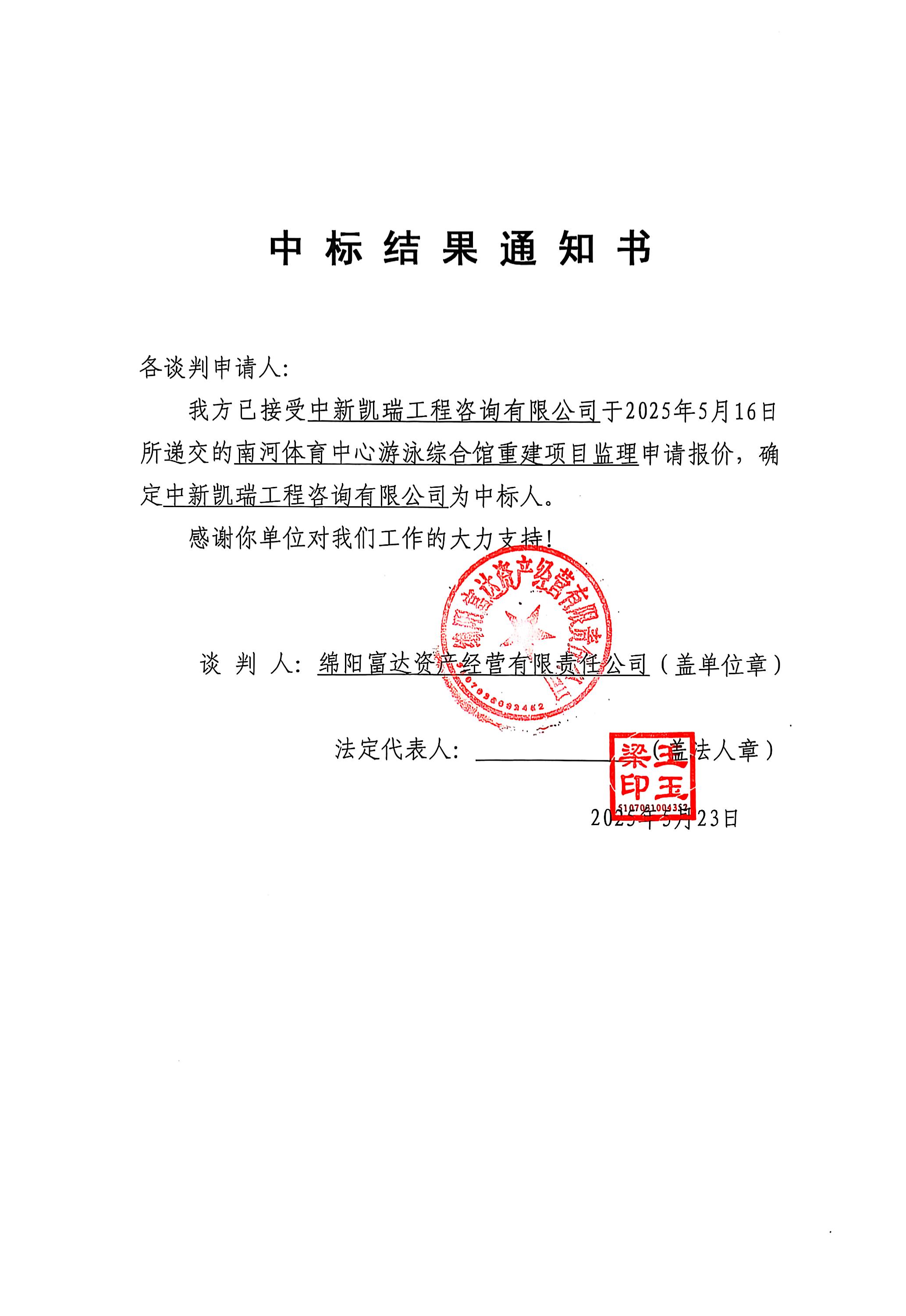 南河體育中心游泳綜合館重建項目監(jiān)理中標(biāo)結(jié)果通知