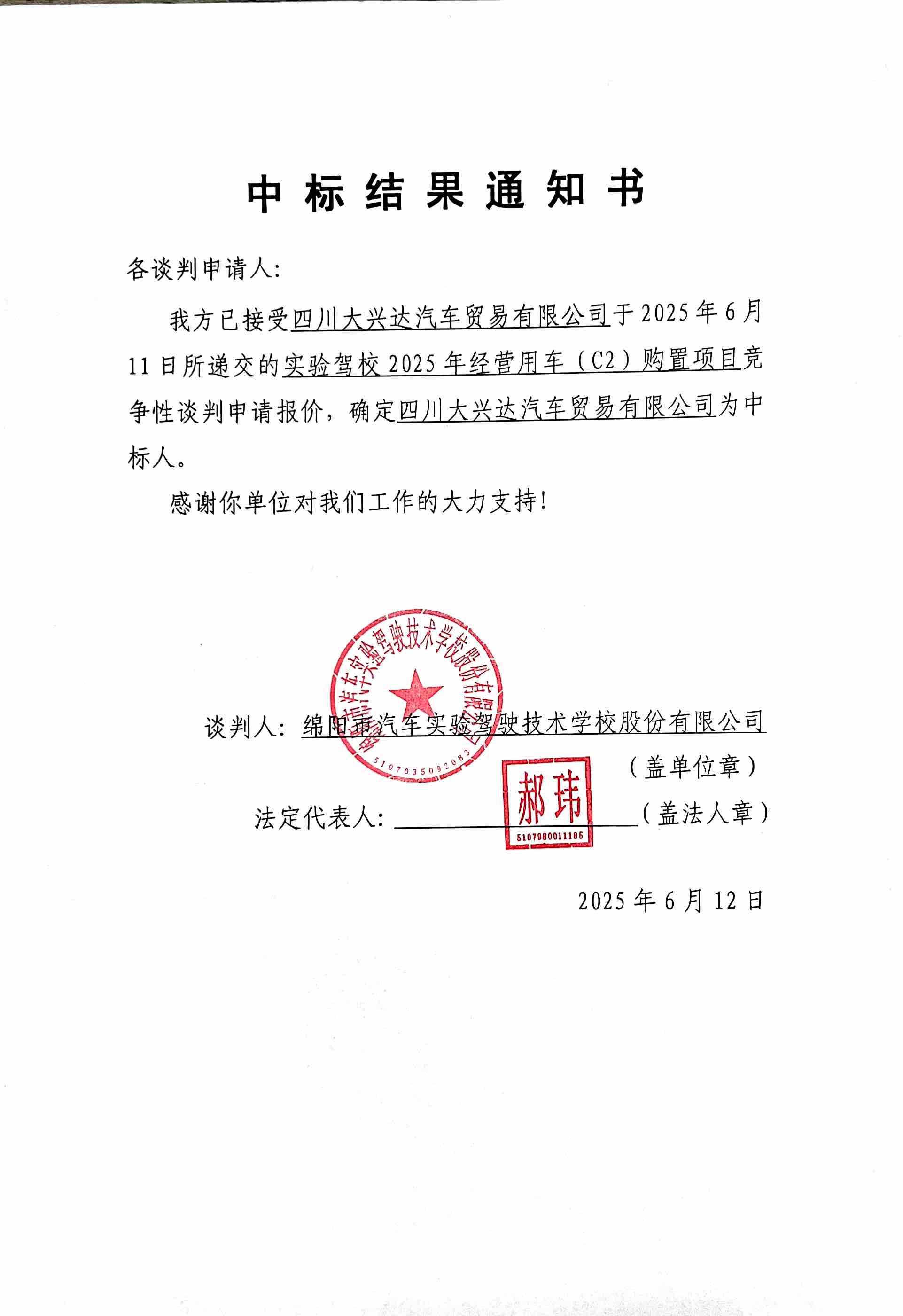 實驗駕校2025年經(jīng)營用車(C2)購置項目中標(biāo)結(jié)果通知