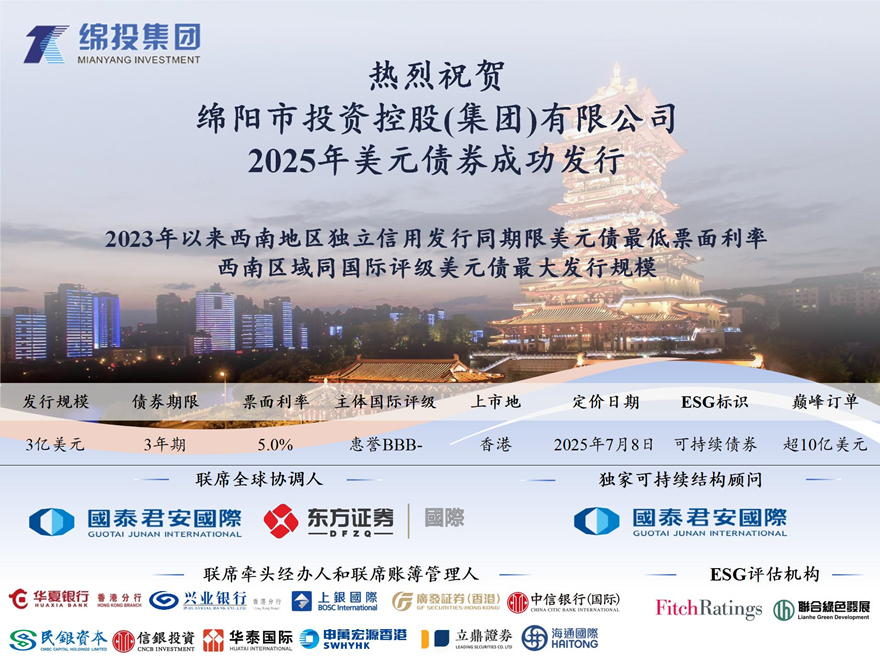 7月8日,綿投集團成功定價發(fā)行3億美元、3年期可持續(xù)美元債券,認購倍數3.43倍(峰值訂單超10億美元),最終票面利率強勢鎖定5.00%,較初始價格指引大幅收窄70個基點,創(chuàng)2023年以來西南地區(qū)獨立信用發(fā)行同期限境外美元債最低票面利率、西南區(qū)域同國際評級美元債最大發(fā)行規(guī)模,以及創(chuàng)2025年以來中資投資級地方國企美元債最大收窄幅度。